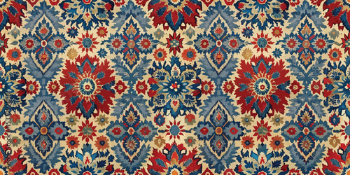 Vibrant floral fabric design with intricate patterns in red, blue, and cream hues.