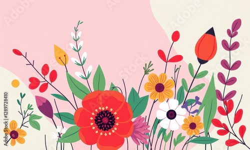 Vibrant Floral Illustration Displaying a Variety of Stylized Flowers and Leaves on a Soft Pink and Beige Background Creating a Harmonious Botanical Scene