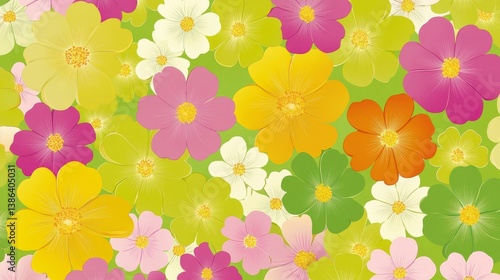 Vibrant floral pattern with colorful blossoms on a green background