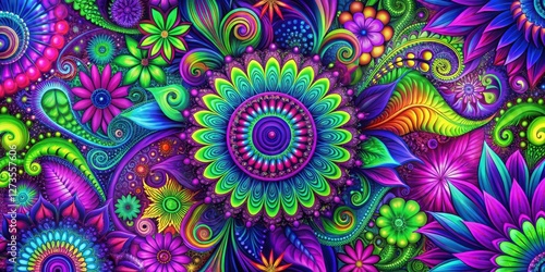 Vibrant floral patterns with psychedelic swirls of purple and pink hues, accented by neon green and blue geometric shapes, geometric shapes, colorful