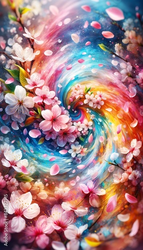Vibrant Floral Swirl with Cherry Blossoms and Colorful Petals - Artistic Abstract Design in Rainbow Hues