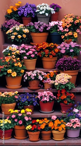 Vibrant Flower Pots on Brick Steps Colorful Spring Garden Scene