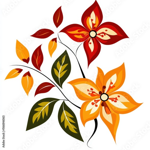 Vibrant flowers bloom with colorful petals and lush green leaves in artistic design