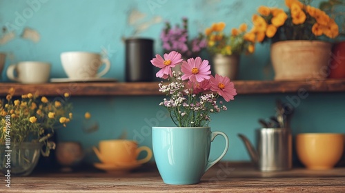 Vibrant flowers in a blue cup on a wooden shelf with colorful pots and plants