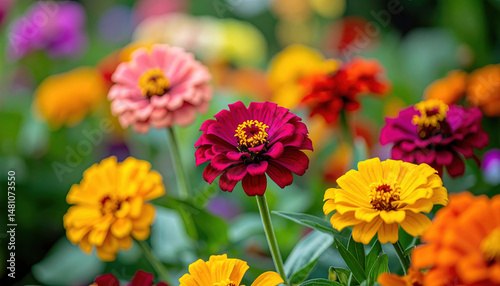 Vibrant flowers in garden display variety of colors and textures, creating lively and cheerful atmosphere