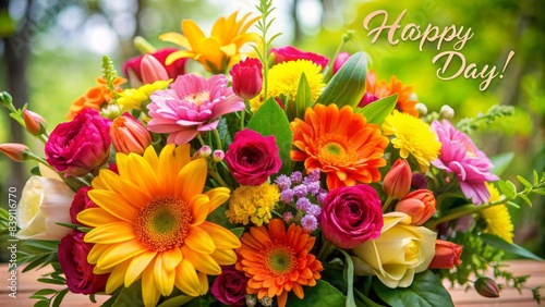 Vibrant flowers in shades of pink, yellow, and orange, surrounded by lush green leaves, adorn a beautiful bouquet with a warm happy mothers day wish.