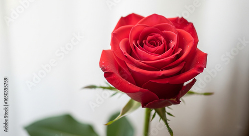 Vibrant Focus on Red Rose bud Against a Soft White Background, copy space