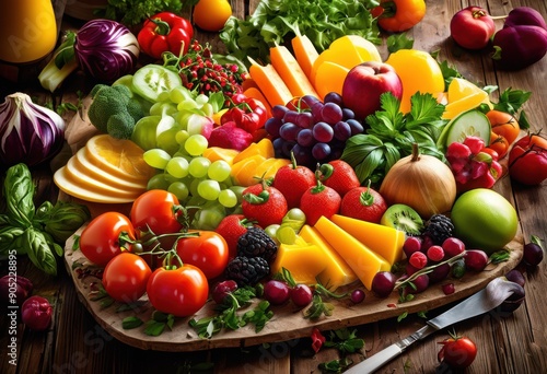 vibrant food presentation colorful fresh ingredients displayed artistically plate, vegetables, fruits, herbs, arrangement, culinary, style, design, texture