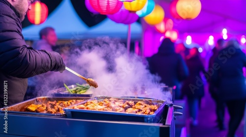 Vibrant food stall at night market featuring steaming dishes and colorful lantern