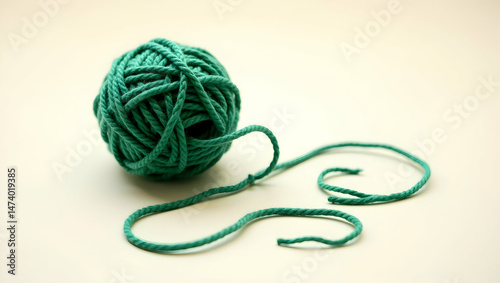 Vibrant forest green yarn ball, A perfect sphere of tightly wound thread, ideal for crafts, knitting, and creative textile projects in a studio setting