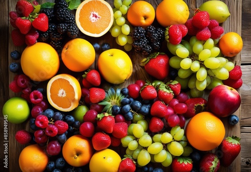 vibrant fresh fruit display weathered wood plank, colorful, rustic, wooden, healthy, delicious, assortment, juicy, ripe, tropical, organic, natural
