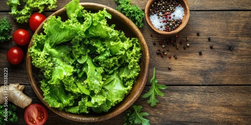 Vibrant fresh green lettuce fills a wooden bowl with scattered spices and cherry tomatoes on a rustic wooden backdrop captured from above.
