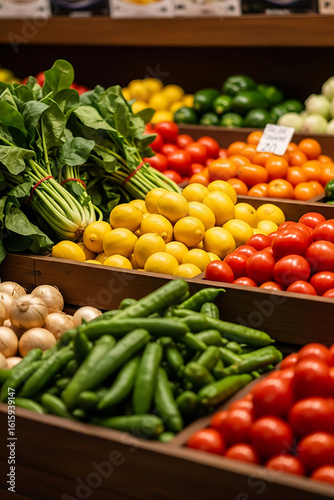 Vibrant Fresh Produce Display: Spinach, Lemons, Tomatoes, and Peppers in Market Bins