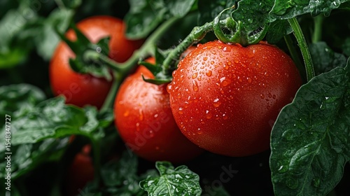 Vibrant, fresh tomatoes glisten with droplets of water as they hang from a generous green vine, showcasing the natural beauty and abundance of nature's bounty.