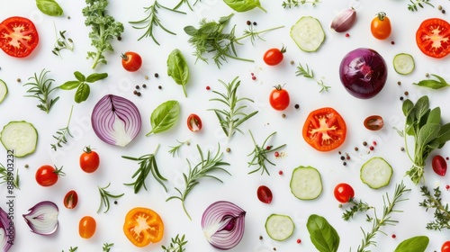Vibrant Fresh Vegetables and Herbs Flat Lay Pattern on White Background