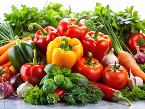 Vibrant Fresh Vegetables and Herbs on Bright White Background - Colorful Produce, Organic Ingredients, Healthy Eating, Culinary Inspiration, Farm-to-Table, Nutritional Variety