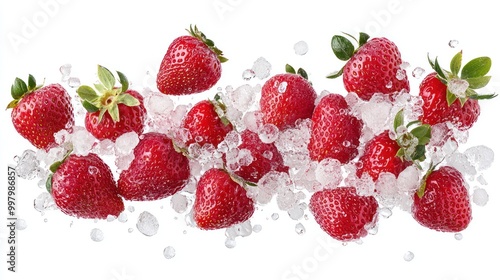 Vibrant Frozen Strawberries Suspended in Mid-Air with Detailed Leaves, Isolated on White Background