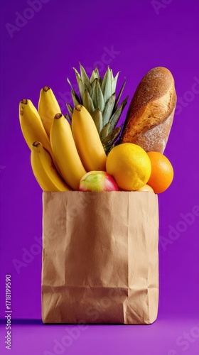 Vibrant Fruit and Bread in Brown Paper Bag Against Purple Background.