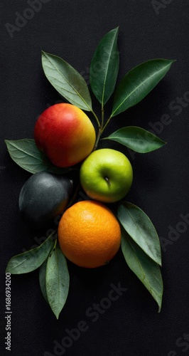 Vibrant Fruit Arrangement with Green Leaves on Dark Background.