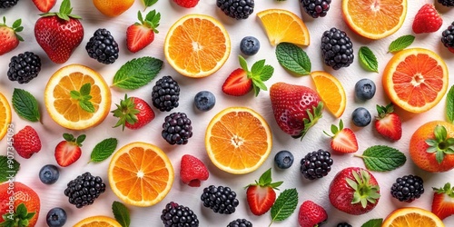 Vibrant fruit pattern featuring strawberries, blackberries, and oranges, juicy, fresh, colorful, summer, tropical, organic