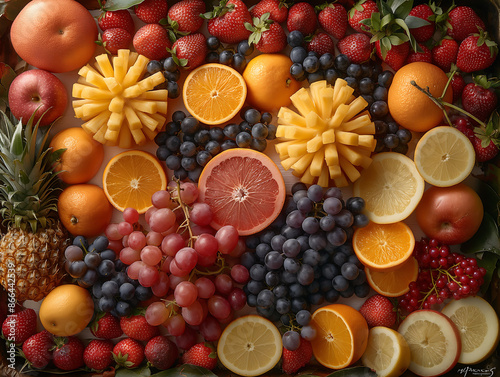 Vibrant fruit platter with fresh oranges, grapes, strawberries, pineapple, and citrus slices. Healthy organic food, tropical fruits, vitamin-rich diet, and refreshing natural snacks.