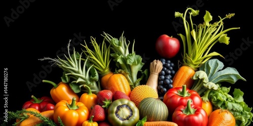 Vibrant fruits & vegetables burst against a stark black backdrop, eating, stock photo