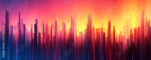 Vibrant futuristic cityscape at dusk with striking color gradients and tall silhouetted structures