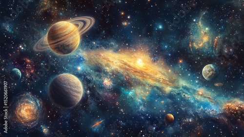 Vibrant Galaxy with Planets and Stars in Deep Space