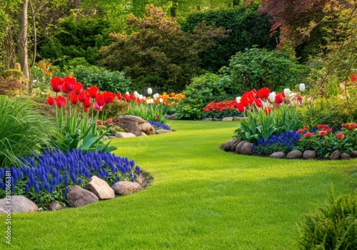 Vibrant garden pathway lined with colorful flowers and lush greenery