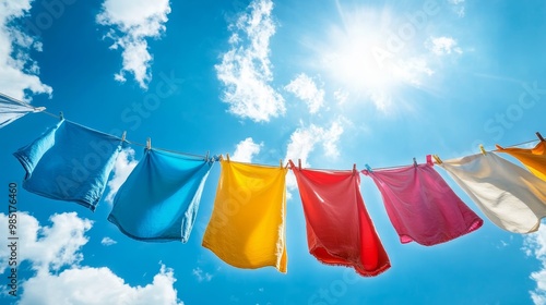 Vibrant garments swaying on a clothesline under a bright sky with moving clouds and sunlight
