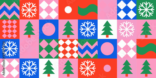 Vibrant geometric christmas pattern with snowflakes and trees in bold colors