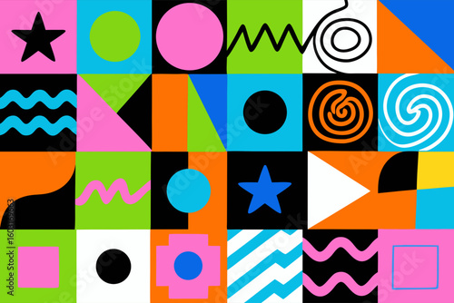 Vibrant Geometric Composition Abstract Artwork Displaying Bold Colors and Playful Shapes for Creative Design