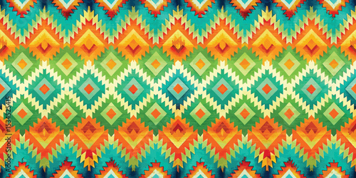 Vibrant geometric pattern in turquoise, orange, and yellow tones.