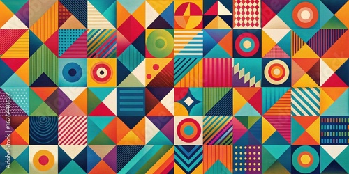 Vibrant Geometric Textile Design Featuring a Kaleidoscope of Interlocking Shapes and Patterns in a Bold and Modern Style