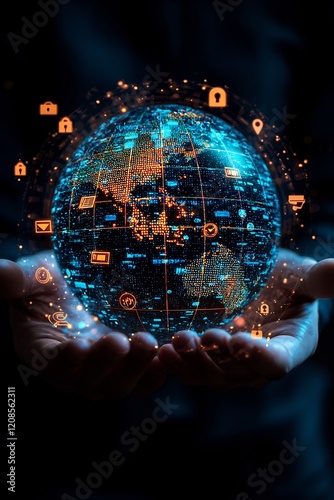 Vibrant globe with hands holding it surrounded by symbols of global growth and collaboration