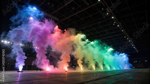 Vibrant, glowing particles suspended in mid-air as vibrant, swirling clouds of colored light, glowing, luminous, explosion