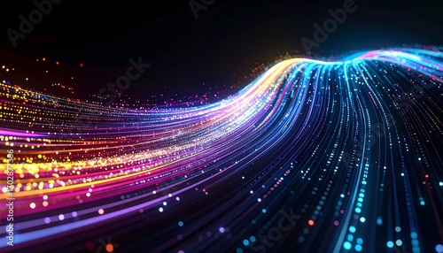 Vibrant, glowing streams of colorful light particles curve across a dark background, suggesting data flow and connection