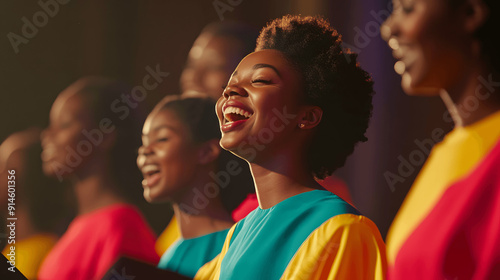Vibrant gospel choir performing in lively service with bright robes and joyful expressions