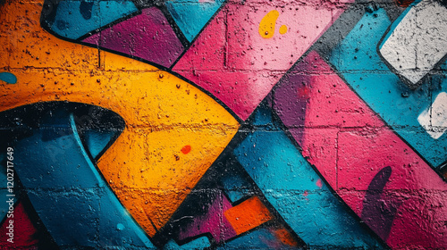 Vibrant graffiti art on brick wall showcasing abstract shapes and bright colors