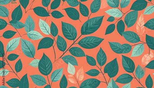 Vibrant graphic botanical seamless pattern with stylized green leaves on a warm coral backdrop