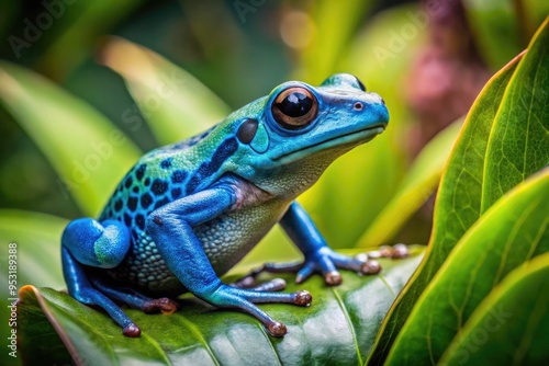 Vibrant green and blue dart frog perches on a leaf in a lush, misty tropical rainforest, its bright eyes fixed on the surrounding vegetation.