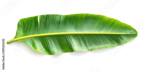 Vibrant green banana leaf lying horizontally on a pristine white background, showcasing intricate leaf veins and lush tropical foliage details.