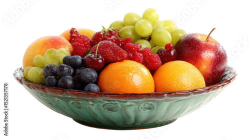 Vibrant green ceramic bowl overflowing with a colorful assortment of fresh, ripe fruits like oranges, grapes, apples, and peaches on a transparent background
