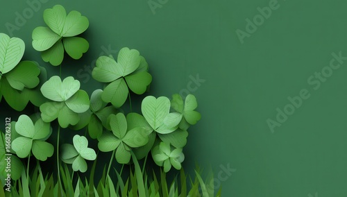 Vibrant green clover leaves and blades of grass create a natural and fresh backdrop with copy space