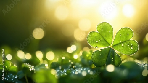 Vibrant green clover with dew drops bathed in golden sunlight, symbolizing luck and renewal in nature's embrace.