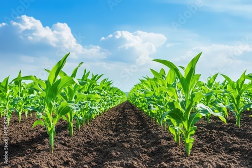 Vibrant green corn plants flourish under a clear blue sky in a sunny rural landscape