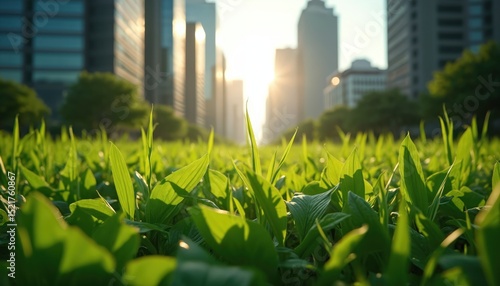 Vibrant green field foreground with skyscrapers in background, illuminated by soft sunlight. City meets nature eco friendly development concept. Urban tech, sustainable urbanism design.