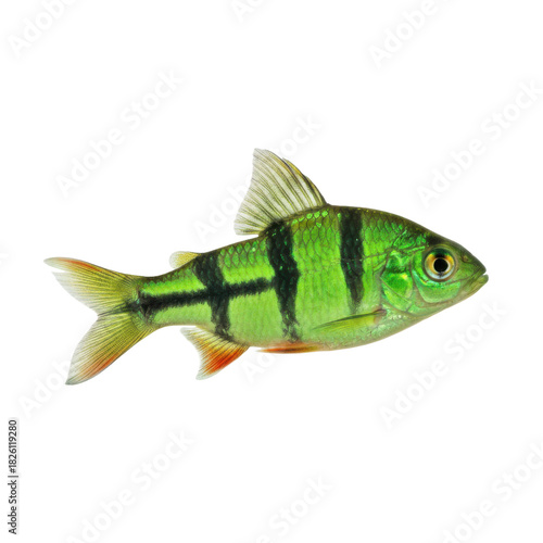 Vibrant Green Fish with Black Stripes Isolated on a Stark Black Background