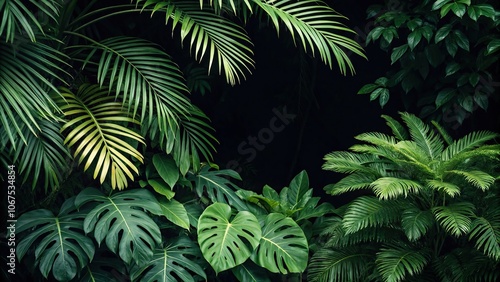 Vibrant green foliage of tropical plants against a dark background, dark tones, garden elements, outdoor setting, closeup nature photography