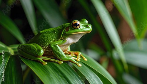 Vibrant Green Frog Perched on Leafy Plant Seen from Below